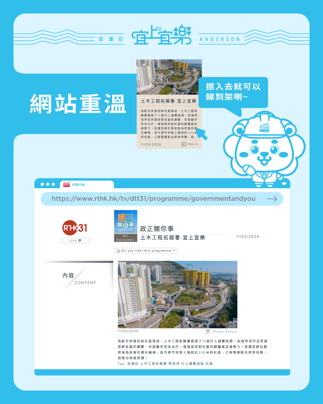 The RTHK TV 31 program ‘政正關你事’, focusing on the development ... more The RTHK TV 31 program ‘政正關你事’, focusing on the development of Anderson Road Quarry site, had already been broadcast. You are welcome to revisit the program: https://www.rthk.hk/tv/dtt31/programme/governmentandyou/episode/1080305.